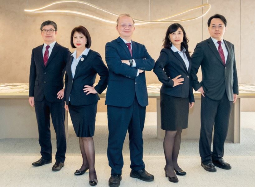 第一銀行高資產業務規模蟬連第一,總經理周朝崇(中)、副總經理甘美珠(左2)率領團隊建立全方位專業服務陣容。
