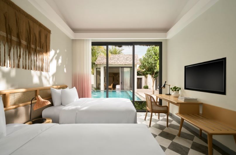 地理位置亦是其關鍵競爭力之一。飯店坐落於被譽為「全球百大最美沙灘」之一的Khem Beach第一排,擁有無可取代的海景資源。整體建築以明亮色彩與幾何線條構成,跳脫傳統度假村的低調風格,轉而展現年輕、活潑的設計語彙。
