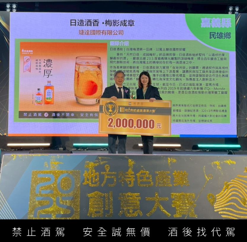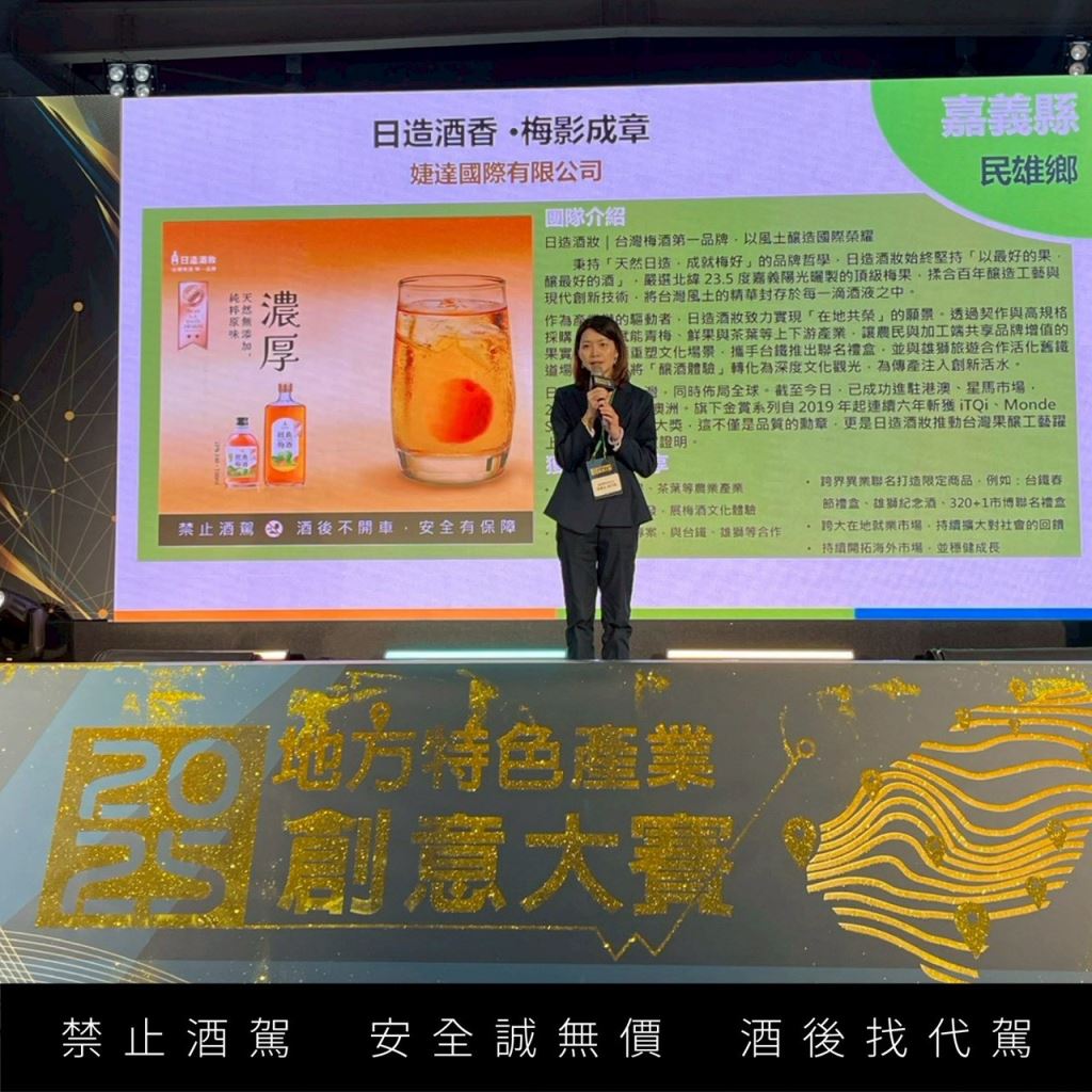 深耕臺灣梅酒產業的領軍品牌「日造酒妝」,以其提案「日造酒香 ∙ 梅影成章」從眾多競爭者中脫穎而出,一舉榮獲「產業高值組」決賽大獎,證明其在提升地方產業價值鏈、文化觀光轉型上的卓越成就與潛力。