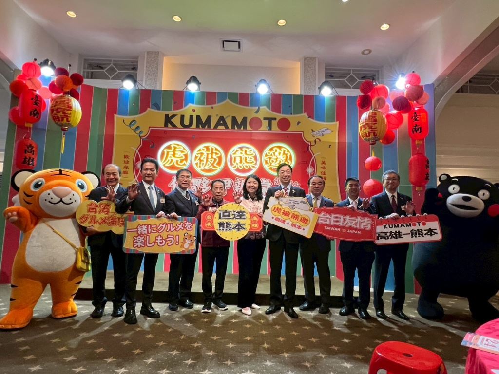 為慶祝高雄-熊本、台南-熊本航線雙首航,台灣虎航於今(24)日在日本九州熊本縣日台會館盛大舉辦「虎被熊邀 作夥呷辦桌」活動,由台灣虎航董事長黃世惠率商務長許致遠及財務長賈瑋中一起主持。本次活動由熊本縣廳,以及中華文化總會共同協辦,並邀請熊本縣知事木村敬、日本熊本縣議會議長髙野洋介、日本衆議院議員坂本哲志、熊本國際機場株式會社代表取締役社長山川秀明、總統府國策顧問康銀壽、台北駐福岡經濟文化辦事處處長陳銘俊、台南市市長黃偉哲、立法委員林俊憲、立法委員許智傑等貴賓齊聚一堂,現場超過百人,氣氛熱鬧溫馨。