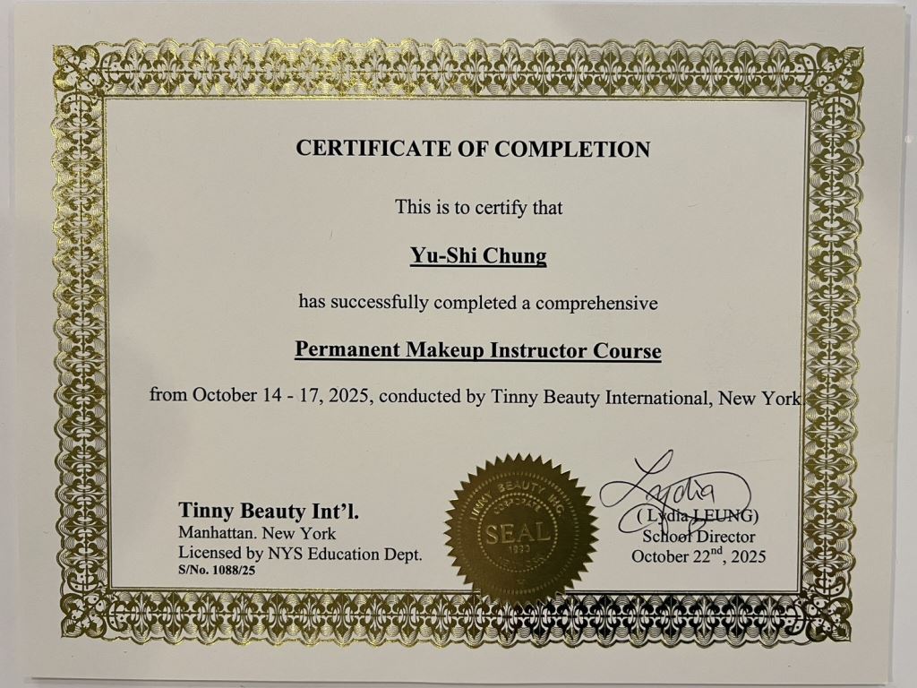 自2023年以來,卓越雜誌鍾瑀希 顧問持續在美國深造,研習半永久美容化妝的菁英進修課程。2025年,更順利完成了半永久講師與顧問課程的研習,並成功考取了紐約州政府認證學校頒發的顧問及講師資格證書。