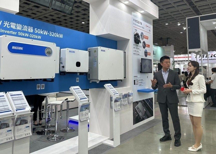 盛達電業Billion品牌多款高效能光電變流器,涵蓋50kW至320kW全系列產品,強調高轉換效率與智慧監控整合能力,獲現場業者高度關注