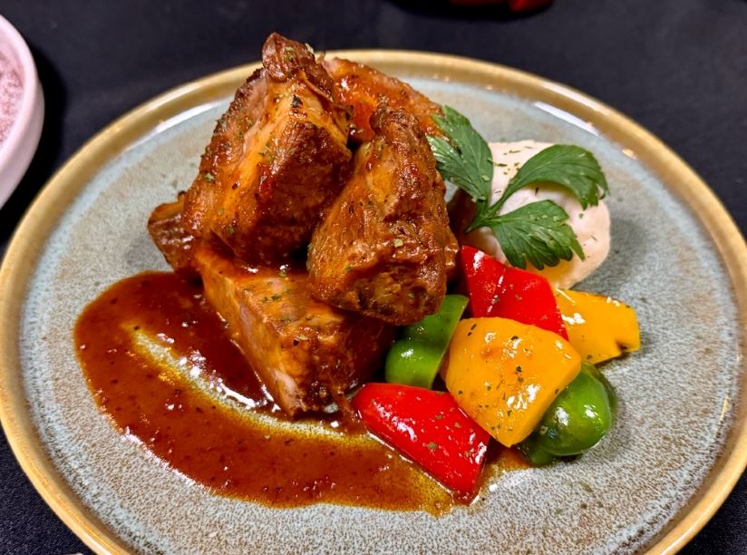 延續這份濃郁香氣,「密蘇里黑角焦糖烤牛肉」以牛胸肉作主角,透過烘烤讓表層焦糖化,香氣飽滿、風味層次清晰。這是一道經典的密蘇里烤肉館風格料理,鹹甜交織、外酥內嫩、內裡保有肉汁,是啤酒愛好者最難抗拒的肉食誘惑。