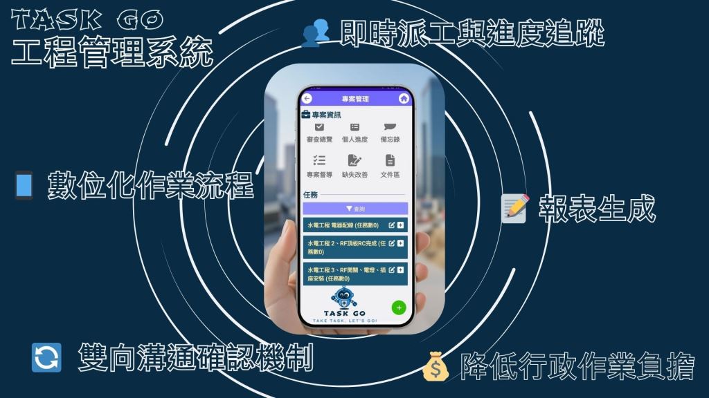 Task Go 工程管理系統以「即時派工與進度追蹤」、「數位化作業流程」、「報表自動生成」及「雙向溝通確認機制」為核心,協助工班與管理單位有效掌握施工進度,降低行政負擔,全面提升工地資訊透明度與作業效率。