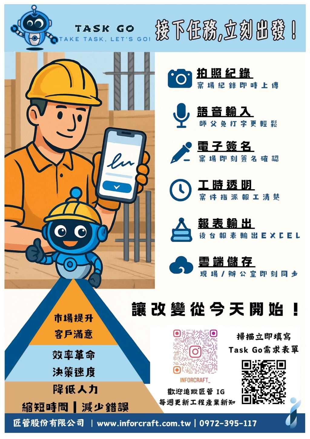 台灣工程服務業長年面臨資訊斷鏈、紀錄分散等管理痛點,尤其在第一線工班與承攬團隊間,紙本施工紀錄與口頭溝通仍為主流,導致工程進度與品質難以即時掌握。為解決這一長期困境,匠管股份有限公司(Inforcraft) 正式推出專為工班設計的數位化管理工具——「Task Go」,以直覺介面與平價方案,協助藍領產業順利踏出數位轉型第一步。
