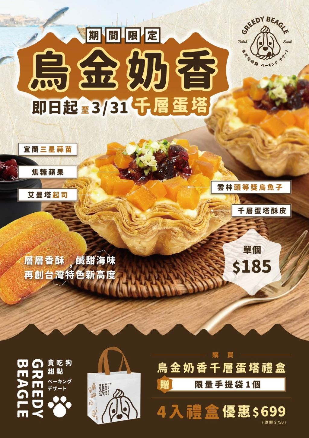 「烏金奶香千層蛋塔」即日起至 115 年 3 月 31 日期間限定販售,單顆售價 185 元,同步推出 4 入禮盒優惠價 699 元,並加贈限量環保手提袋 1 個,無論是走親訪友、企業送禮,或犒賞自己,都相當合適。