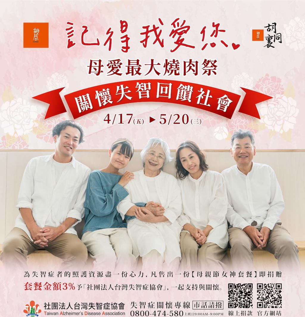 衛生福利部的調查發現,目前全台65歲以上失智症人數已超過30萬人,平均每13位就有一位失智。為了讓社會大眾對於失智症者的照護資源有更多關懷與支持,4月17日起至5月20日期間,到胡同燒肉、胡同裏燒肉用餐,凡點購《母親節女神套餐》,品牌即捐贈套餐銷售金額3%予「台灣失智症協會」,期盼透過大眾的支持,讓更多家庭在面對挑戰時,不再孤單。