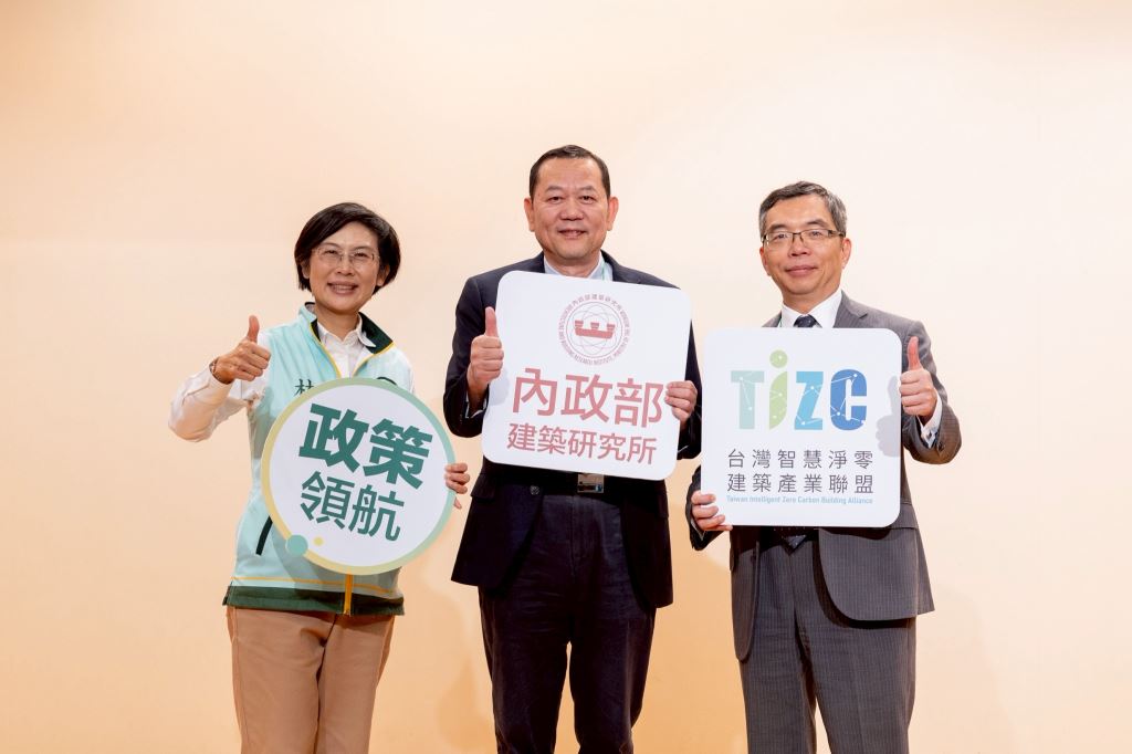 立法委員林岱樺(左)、內政部建築研究所主任秘書欒中丕(中)、台灣智慧淨零建築產業聯盟秘書長孟義超(右