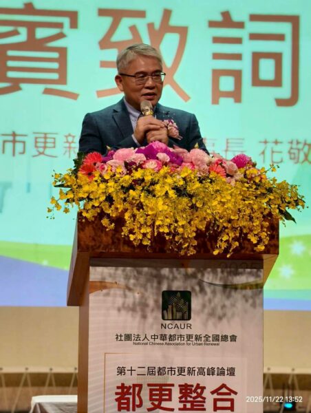3. 國家住都中心董事長花敬群出席「第12屆都市更新高峰論壇」致詞時強調,都更成功關鍵在於建立社區與業者間的信任機制,並呼籲整合人制度應加速法制化,以提升都市更新效率與品質。圖/中華資產鑑定中心提供